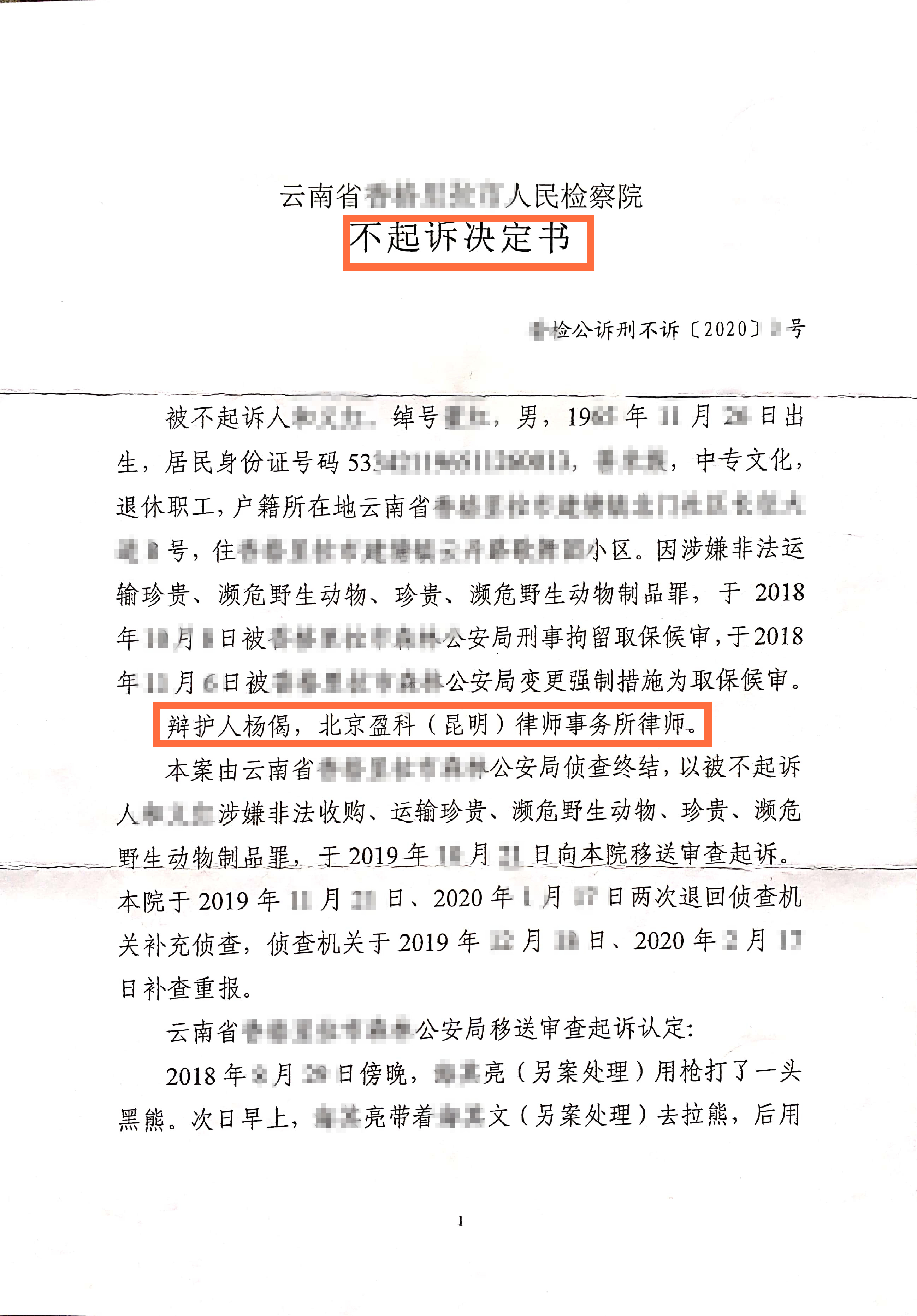 本网2019年10月23日关注的“云南省迪庆州某地‘五保户’韩某某等人在大山深处猎杀了一只保护动物——“熊”(“鱼和熊掌不可兼得”的“熊”),退休人员何先生被指控帮助买家从山上路边将熊拉回家中,涉嫌运输珍贵、濒危野生动物罪被当地公安立案侦查,委托我所杨偈律师担任辩护人提供法律帮助”一案,今日有了终局性进展——何先生获得了无罪结果。